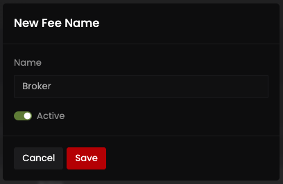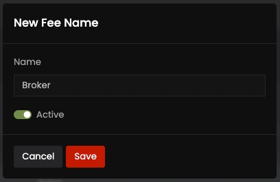 Click the (+) button on the Fee Names section of the screen to add a new fee type. Provide a name for the fee type and click save. The new fee type can be used on Trades and Fee Recommendations.
