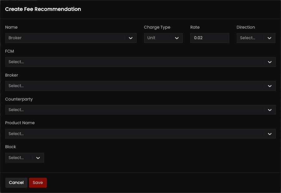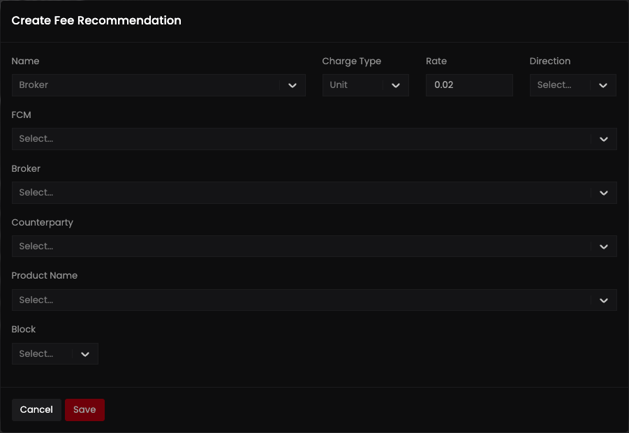 Fee recommendations are schedules that are used to apply fees automatically to trades. Click the (+) button on the Fee Recommendations section of the screen to add a new fee recommendation. Select a Name, Charge Type and Rate. Provide as many remaining attributes as necessary to create the proper fee recommendation.