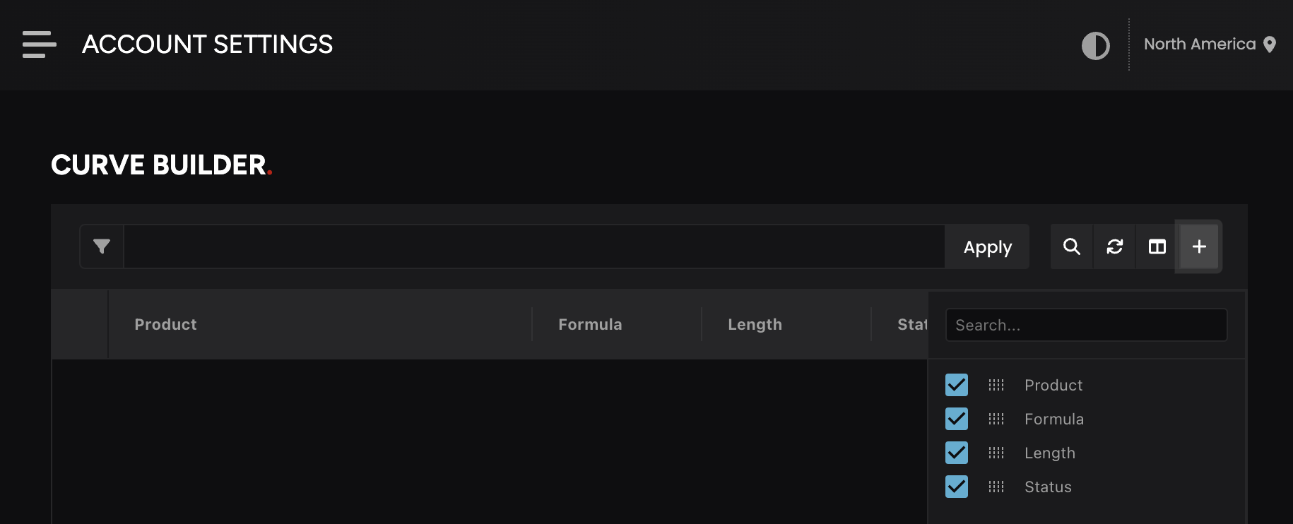 Upon accessing Curve Builder, you’ll land on the list page where you can build a new curve by clicking the (+) button or manage an existing curve by clicking on a curve. 💡 Tip: Find an existing curve by using the filter bar by typing a product name or clicking the search icon.