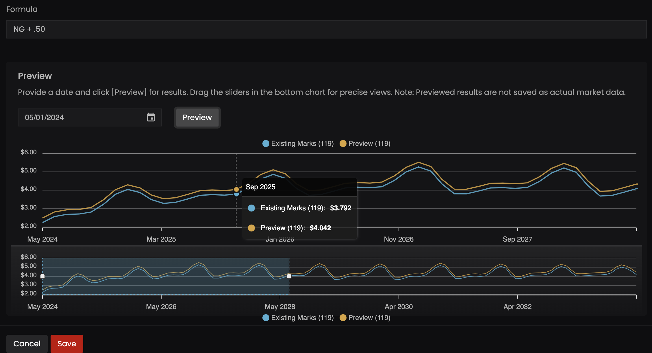 Apply custom formulas to create forward curves. Forward curves are automatically updated with current market data for marking, settling, valuations and exposures while maintaining an audit history.