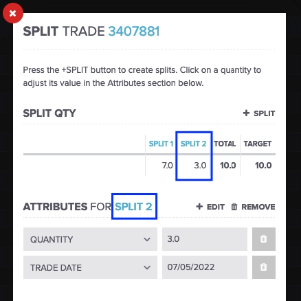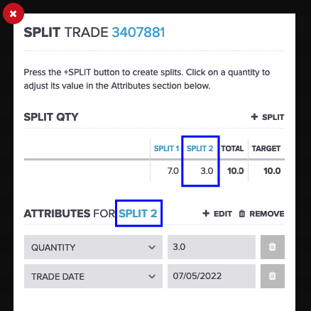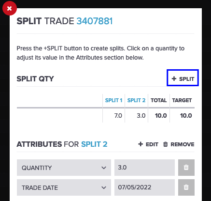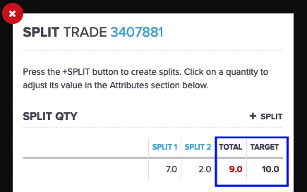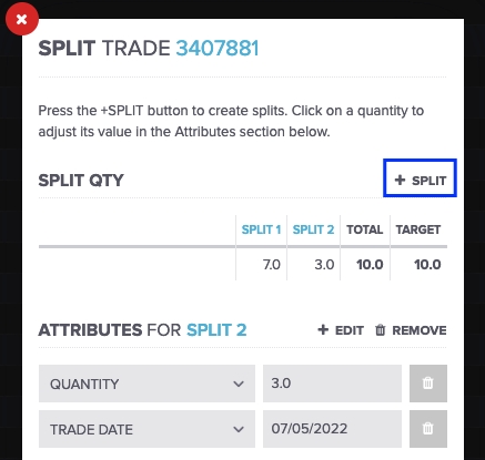 New trades can be added by clicking the + SPLIT button. The quantities for the split trades are changed in the attributes section of the form.