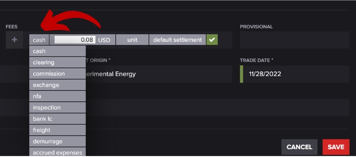 Next, select whether the fee is a unit, flat, or contract by clicking on the gray 3rd box. Select the settlement date by clicking on the fourth box and choosing a date on the calendar: