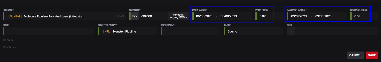 Trade entry begins like all other entry in Molecule, by selecting a product. When a product is selected that is enabled for park and loan deal entry, the form provides two sets of dates and price. This allows the user to specify the dates and price of the initial injection into or withdrawal from the pipeline as well as the dates and price of the subsequent return from or to the pipeline.