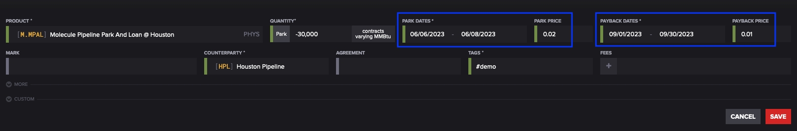 Molecule supports a dedicated trade entry form designed to facilitate capturing natural gas park and loan deals. The purpose of this entry form is to create both sides of a park and loan deal from a single trade entry.