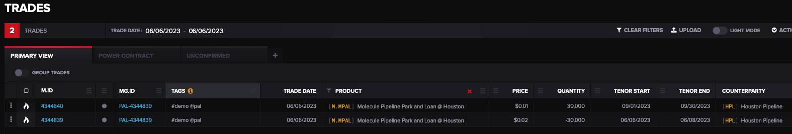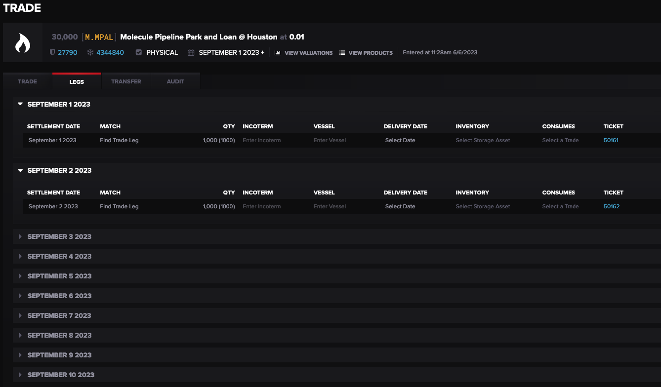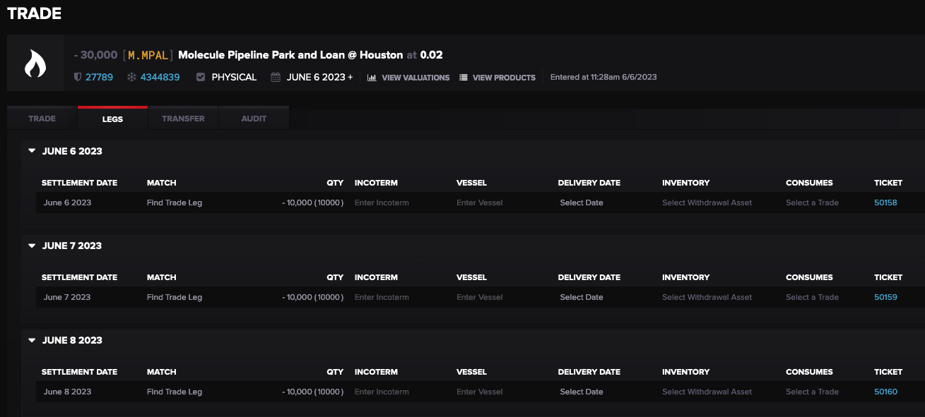 The two trades have the trade entry quantity split evenly across legs for each calendar day of the periods selected. Each leg automatically creates a delivery ticket which can be actualized to reflect the actual gas movement.