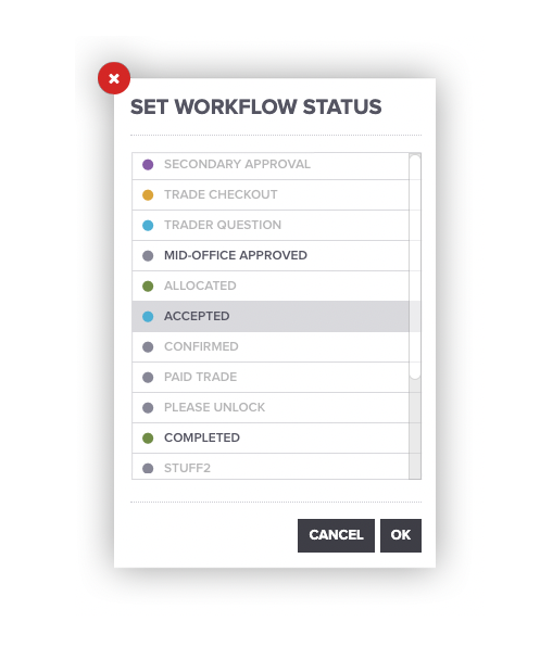 A: You can set a status on a trade when (a) you have permissions for that status and (b) the trade is unlocked. If any of the selected trades are locked, the Set Workflow Status option will be inactive and marked with a padlock icon. Locked trades cannot have their status changed until they are unlocked