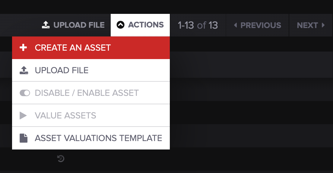 Open the ACTIONS drop-down menu on the right-hand side of the screen, and select CREATE AN ASSET: