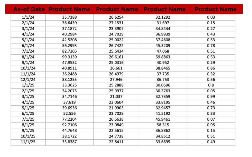 Fill in your product names/codes, as-of date, and marks for as many products as you need. The final results should look something like this: